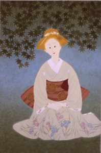 本作は、1986年再興第71回院展に出品された映月の院展最後の出品作です。青々と生い茂った木陰に座る着物姿の女性が描かれ、清楚で気品漂う作品となっています。
